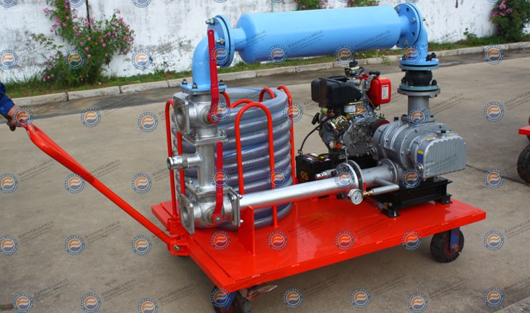 The diesel vacuum power station with a vacuum pump driven by a diesel engine or motor, resulting in a vacuum in the buffer tank, can collect oil spills on beach, ground or water surface into a buffer tank through the suction head. The collected oil spills are then pimped into the oil storage facility on the shore or boat, so that the recovery function can be achieved.?